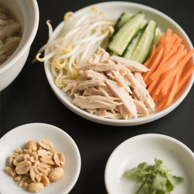 1、雞胸肉煮熟撕成細絲,將豆芽焯水,黃瓜、胡蘿卜切絲,準(zhǔn)備一小把花生碎。