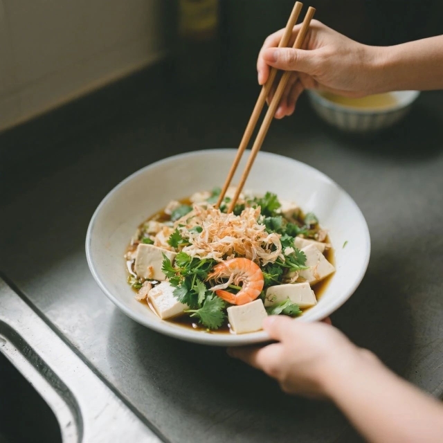 ? 豆腐切塊焯水,加蝦皮、香菜、香油、鹽拌勻。