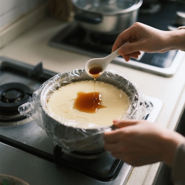 ? 蛋液加溫水?dāng)噭?,撇去浮沫,蓋保鮮膜扎孔;