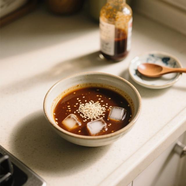 2勺芝麻醬+1勺昆布醬油+1勺米醋+1/4勺姜汁+5克白芝麻粒+3勺冰水。