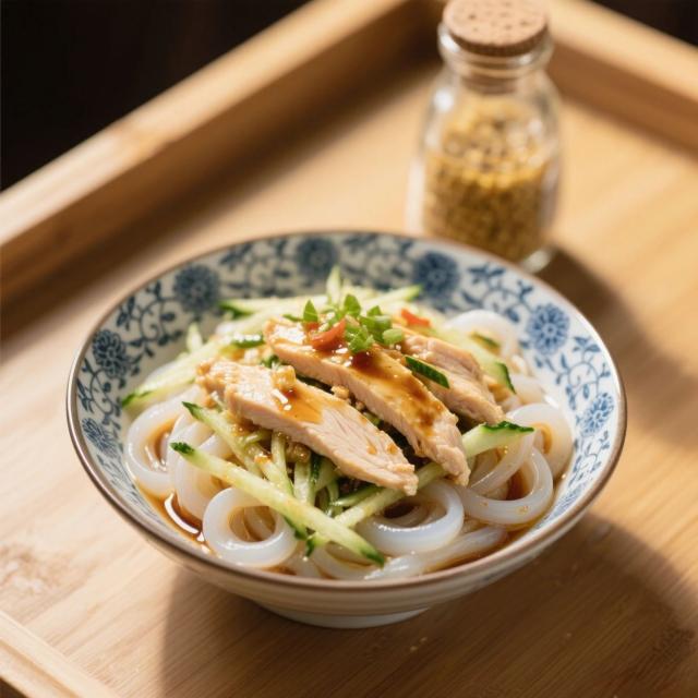 【做法】即食魔芋面冰鎮(zhèn)瀝干;雞胸肉煮熟撕條;黃瓜切絲;混合后淋入日式輕盈醬汁(參考如上調(diào)制秘籍做起來)+3滴學(xué)步橋小磨香油