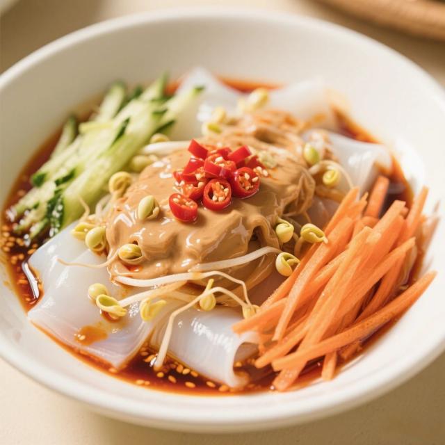 夏天最受歡迎的涼皮和涼面,配上麻醬汁才是絕配。將涼皮或煮好晾涼的面條放入碗中,加入黃瓜絲、豆芽、胡蘿卜絲等配菜,淋上麻醬汁,再加點(diǎn)辣椒油,攪拌均勻,一碗下肚,暑氣全消。