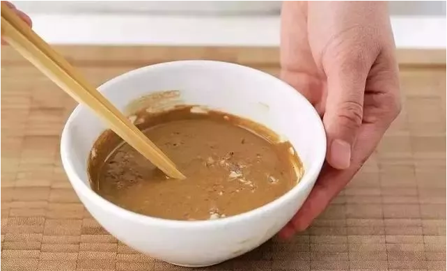 2、取芝麻醬盛不銹鋼小盆內(nèi),先分次加入500克清水,用筷子順一個方向攪拌成稠糊狀。然后,依次加入白糖、鹽、味精、桂林辣醬、蒜蓉和香油,充分?jǐn)嚢杈鶆颍帽ur膜封口,入冰箱保鮮,以便隨時(shí)取用。