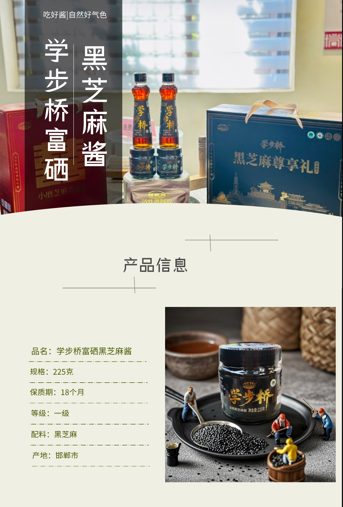 學(xué)步橋富硒黑芝麻醬,原料富硒黑芝麻來(lái)自世界硒都江西宜春,那里的土壤天然富硒,滋養(yǎng)出優(yōu)質(zhì)黑芝麻。制作時(shí),先經(jīng)層層篩選、清洗,去除雜質(zhì),再經(jīng)石磨低溫物理研磨,全程無(wú)菌操作,最大程度保留營(yíng)養(yǎng)。它質(zhì)地細(xì)